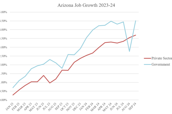 While the headline number of new jobs last month initially looks great, of the 11,200 jobs, nearly 2/3 of them were government jobs, with private sector growth significantly slower. We’ve raised concerns in the past about the alarming rate at which government jobs at all levels have grown under Governor Katie Hobbs. This month, the jump in government jobs is primarily the result of public-school teachers returning to work after summer vacation. Although it is notable that this marks the highest level of government jobs in Arizona ever.
